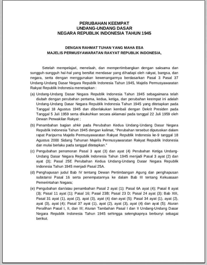 IV. Perubahan Keempat UUD 1945 tanggal 10 Agustus 2002. Perubahan dilakukan dengan tanpa terlebih dahulu membatalkan dasar hukum pemberlakuan UUD 1945 yaitu: