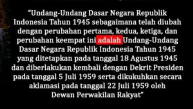 Catatan: UUD 2002 atau UUD 45 Amandemen ini dalam pandangan kami tidak sah secara DeJure namun secara politik atau secara De Facto dia digunakan/berlaku pada saat ini.